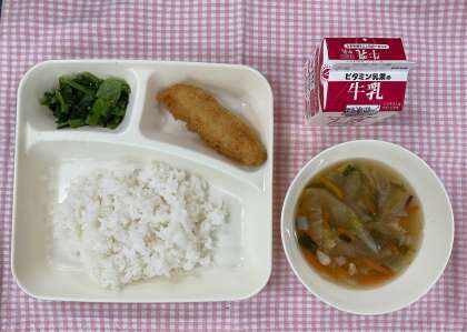 13日の給食は「ごはん、たらフライ、うすくず汁、こまつなのごまあえ、牛乳」でした。たらフライはボリュームがあり、大好評。こまつなは食感よく、色合いもきれいで、おいしく仕上がりました。はじめは少なめに盛り付けたけれど、食べてみておかわりをしてくれる子もいました。