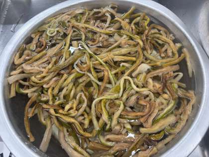 今日の給食は「ごはん、豚肉と干しずいきのみそ煮、五目汁、焼きじゃが、牛乳」でした。ずいきはさといもの葉柄(ようへい)という部分です。しっかりあく抜きをしてから柔らかく煮て仕上げました。毎年出ているのですが「これ何?」と聞かれます。最近は食べる機会が少なくなってきているので、ぜひ給食で食べてみてほしい食材です。
