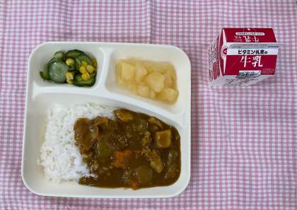 今日の給食は「チキンレバーカレーライス、きゅうりとコーンのサラダ、洋なし(カット缶)、牛乳」でした。今日のカレーライスにはチキンレバーのペーストが入っています。独特の香りがしますが、カレーの香りが強いので多くの子どもは気にならず、おいしく食べることができたようです。デザートの洋なし(カット缶)は山形県産でした。
