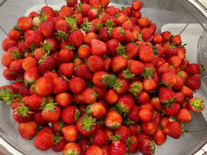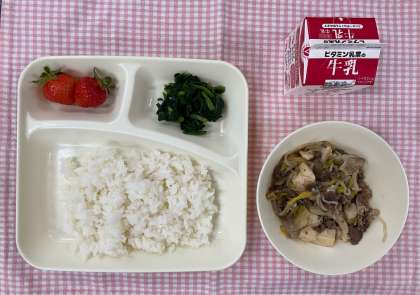 26日の給食は「ごはん、すき焼き煮、ほうれんそうのおひたし、いちご、牛乳」でした。子どもに大人気の献立でした。いちごは1人2個。ほうれんそうの緑もきれいで、盛り付けた給食は色合いもきれいでした。