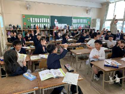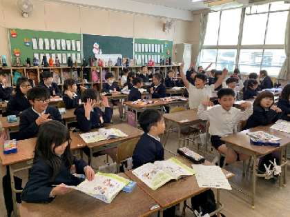 授業の初めに、2年生の教室から元気な歌声が聞こえてきました。今日は、歌のテストのようです。発声練習を兼ねて歌を歌っています。手ぶりも加えながら、とても楽しそうに歌っています。最後も、決めポーズ!!