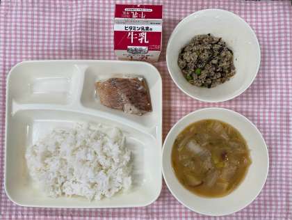 2月28日の給食は「ごはん、あかうおのレモンじょうゆかけ、さつまいものみそ汁、高野どうふのいり煮、牛乳」でした。あかうおはレモンのさっぱり風味のしょうゆだれがかかって大人気!みそ汁はさつまいもの甘みもあり、おいしい仕上がりでした。