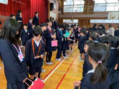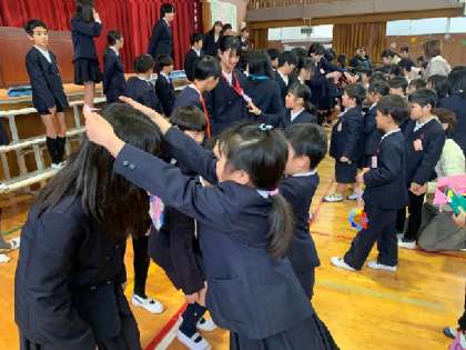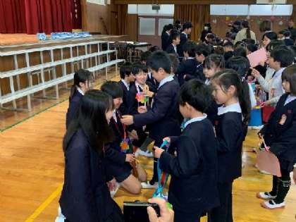 卒業をお祝いする会 3月5日(水) 公開日 2025/03/05 更新日 2025/03/05 お知らせ 1年生から手作りのメダルを、2年生からメッセージカードを贈りました。6年生は、低学年の児童の高さに合わせて、笑顔で受け取ってくれました。 いいね(0)