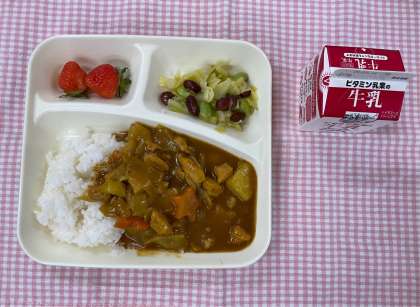 今日の給食は「チキンカレーライス、ビーンズサラダ、いちご、牛乳」でした。ビーンズサラダはキャベツに金時豆、枝豆が入ったサラダです。豆ばかりではないので食べやすかったです。いちごはやはり大人気!ラッキーにんじんもあって、大好評の献立でした。