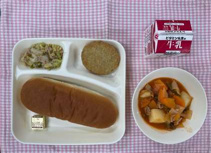 今日の給食は「コッペパン、チキンレバーカツ、ケチャップ煮、ツナとキャベツのバジルソテー、バター、牛乳」でした。チキンレバーカツは、ほんのりカレー味でいつも好評です。ソテーはバジルの風味がとてもよかったです。オリーブ油でキャベツ、ツナを順にいため、塩、こしょう、うすくちしょうゆ、バジルで味付けするだけの簡単メニューです。ぜひお家でもどうぞ!
