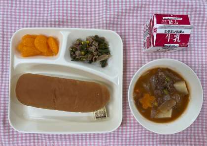 17日の給食 公開日 2025/04/17 更新日 2025/04/17 給 食 今日の給食は「コッペパン、ビーフシチュー、ベーコンとさんどまめのソテー、みかん(缶)、バター、牛乳」でした。ビーフシチューは、小麦粉を使ったルウではなく、上新粉でとろみをつけています。あっさりした仕上がりですが、小麦アレルギーがあっても食べることができるシチューです。お花の形のラッキーにんじんも入り、大好評でした。 いいね(0)