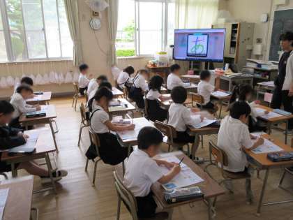 ひらがなの学習を進めています。大きなスクリーンのお手本を見て、ひらがなの形や書き順を確認しながらノートに練習しています。