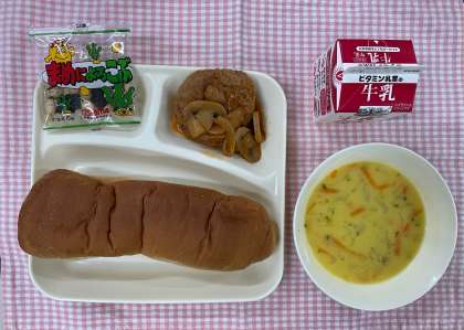今日の給食は「黒糖パン、煮こみハンバーグ、コーンスープ、豆こんぶ、牛乳」でした。煮こみハンバーグはふわふわで大好評!たまねぎとマッシュルームもおいしく煮こんでありました。コーンスープはコーンだけではなく、キャベツやにんじん、色どりのパセリが入っています。コーンは粒とペーストも入っているので、とてもなめらかな仕上がりでした。