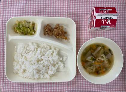 今日の給食は「ごはん、鶏肉のたつたあげ、五目汁、キャベツの梅風味、牛乳」でした。たつたあげは、本当に大人気メニューです。給食時間は大盛り上がり!学習参観前に、おいしく食べてパワーをつけることができました。