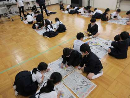 1組と2組で一緒に新聞紙を使って、兜を折りました。