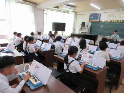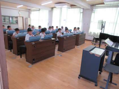 音楽室で、鍵盤ハーモニカの指づかいを練習しました。