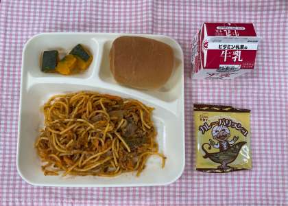 9日の給食 公開日 2025/05/09 更新日 2025/05/09 給 食 今日の給食は「ミニコッペパン、ミートソーススパゲッティ、焼きかぼちゃ、カレーフィッシュ、牛乳」でした。ミートソーススパゲッティは大好評!おかわりしてくれる子もたくさんいました。 いいね(0)