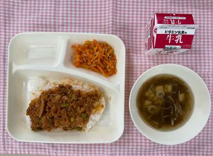 今日の給食は「タコライス、とうふともずくのとろり汁、にんじんしりしり風、牛乳」でした。タコライスはひき肉たっぷりで大好評!とろり汁はもずくのつるんとした食感も人気でした。にんじんしりしり風は、にんじんとささみ、かつおぶし、みりん、うすくちしょうゆを混ぜ合わせて焼き物機で焼きました。甘み、うま味があり、食べやすかったようです。