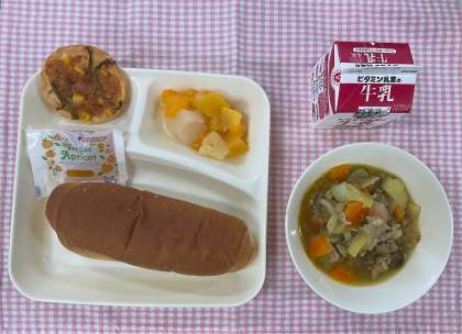 今日の給食は「コッペパン、豚肉と野菜のカレースープ煮、変わりピザ、ミックスフルーツ(缶)、アプリコットジャム、牛乳」でした。今日の変わりピザは、今までのチーズとは違う、米由来のチーズを使用しています。出来上がりの見た目は、今までのピザと変わりありません。子どもたちは、特に気にせず食べていましたが、少し風味が違うようにも思えました。このチーズを使用したので、乳アレルギーがあっても食べることができるピザに仕上がっています。