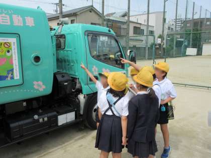 環境事業局の方に学校へお越しいただき、パッカー車の見学や、ごみの分別、処理について学習しました。