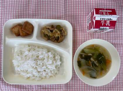 今日の給食は「ごはん、ホイコウロー、中華スープ、あつあげのピリ辛じょうゆかけ、牛乳」でした。ごはんによく合う献立で大好評!今日から修学旅行に行っている6年生も「食べたかった!」と言っていた献立です。ごちそうさまでした!