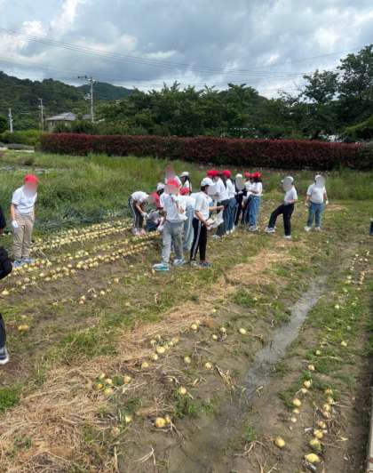 どろんこ体験(タマネギひき)です。 朝方までの大雨で、畑はとても柔らかくなっていました。