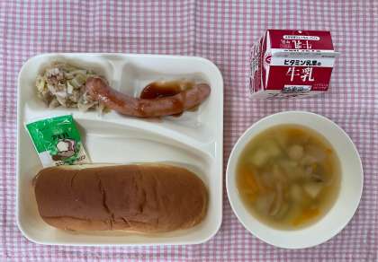 27日の給食は「コッペパン、ウインナーのケチャップソース、スープ、焼きツナキャベツ、マーガリン、牛乳」でした。ウインナーは長くて、みんなびっくりしましたが、パンにはさんだり、食べやすい大きさにスプーンで切ったりしておいしく楽しく食べました。