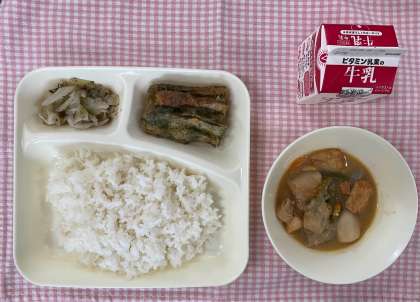 28日は「ごはん、ちくわのいそべあげ、あつあげとさといものみそ煮、キャベツの赤じそあえ、牛乳」でした。青のりの入った衣でつくったいそべあげは大好評!ちくわは思っている以上にかみごたえがあったので、しっかりかんで食べました。