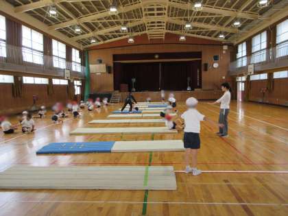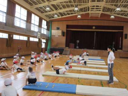マット運動をしています。手で体を支えて上手く回ることができるように練習中です。