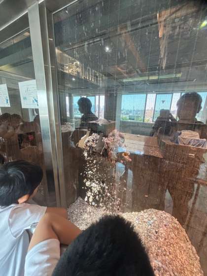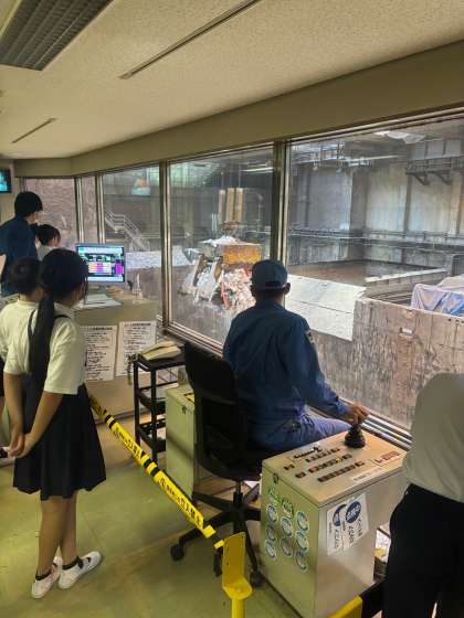 ゴミピット内のクレーンと、クレーンを動かす作業員さんの様子です。