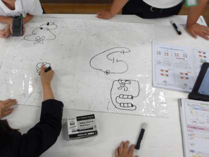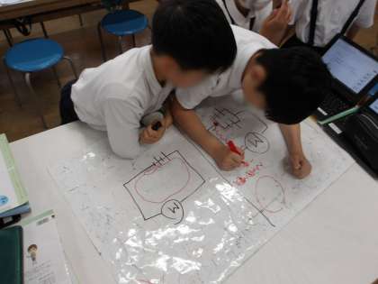 モーターが速く回る電池のつなぎ方は、どのようにすればいいか相談しながら実験を進めています。