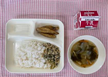 5日の給食は「ごはん、いわしてんぷら、五目汁、とりなっ葉いため、牛乳」でした。いわしてんぷらはしょうゆのたれがかかっていたので、ごはんとよく合いました。ごはんにかけるとりなっ葉いためもあったので、ごはんがすすむ給食でした。