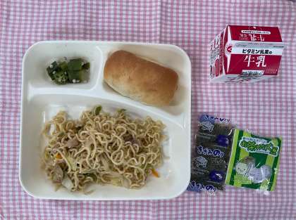 今日は「ミニコッペパン、和風やきそば、オクラのかつお梅風味、まっ茶大豆、牛乳」でした。今日は大人気の献立!みんなでおいしくいただきました。