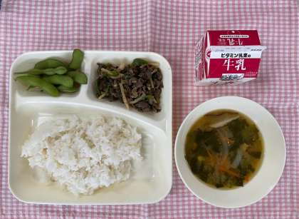 9日の給食は「ごはん、チンジャオニューロウスー、中華みそスープ、えだまめ、牛乳」でした。この日はどれも大人気でした。えだまめはさやから出して煮ものなどに入っているよりも、さやつきのままの方が特に人気です。