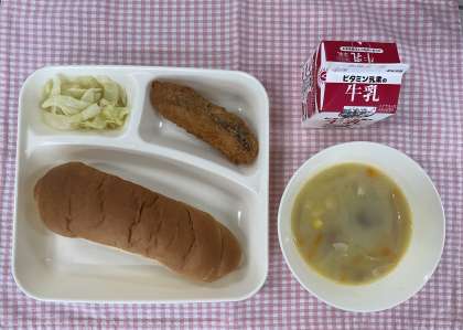 今日は「黒糖パン、サーモンフライ、豆乳スープ、キャベツのゆずドレッシング、牛乳」でした。サーモンフライはボリュームがあり、大人気!パンにはさんで食べている子もいました。
