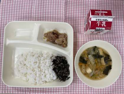 6月11日の給食 公開日 2025/06/11 更新日 2025/06/11 給 食 今日の給食は「ごはん、鶏肉の甘辛焼き、みそ汁、魚ひじきそぼろ、牛乳」でした。魚ひじきそぼろは、魚ミンチとひじきを甘辛く味付け、しそで風味よく仕上げました。ごはんによく合い、好評でした。 いいね(0)