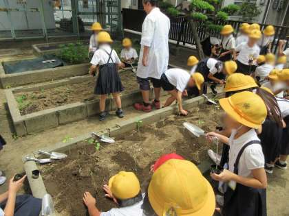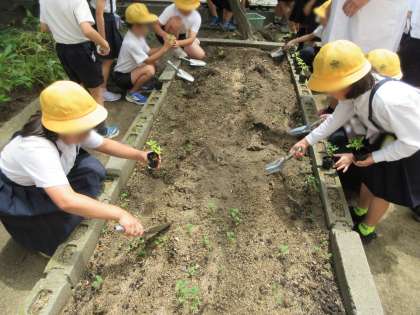 苗ポットのひまわり、ホウセンカ、マリーゴールドが大きくなってきたので、学習園に植え替えをしました。