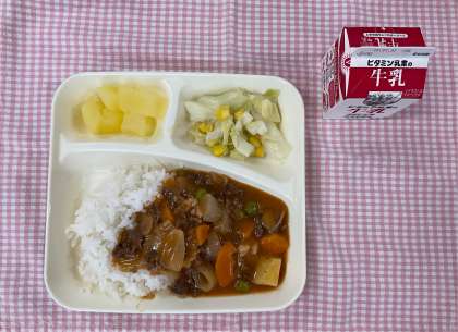 20日の給食は「おさつパン、鶏肉とかぼちゃのシチュー、ミックス海そうのサラダ、オレンジ、牛乳」、23日は「ハヤシライス、キャベツとコーンのサラダ、りんご(カット缶)、牛乳」でした。