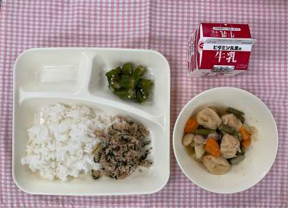 3日の給食は「ごはん、鶏肉と一口がんもの煮もの、オクラの梅風味、ツナっ葉いため、牛乳」でした。一口がんもはふっくらと仕上がっていて、味もしっかりしみ込んでいました。ツナとだいこん葉でつくったツナっ葉いためはごはんとよく合い、ごはんをしっかり食べることができました。