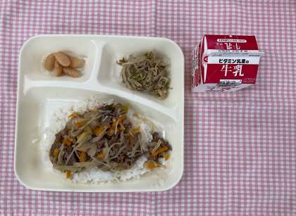 7月9日の給食 公開日 2025/07/09 更新日 2025/07/09 給 食 今日の給食は「牛丼、もやしとピーマンのごまいため、大福豆(おおふくまめ)の煮もの、牛乳」でした。牛丼はボリュームがあり好評!豆は苦手な子が多いのですが、少し甘めの味付けにして、食べやすいようにしました。丼はみんな食べ終わるのが早いようです。 いいね(0)