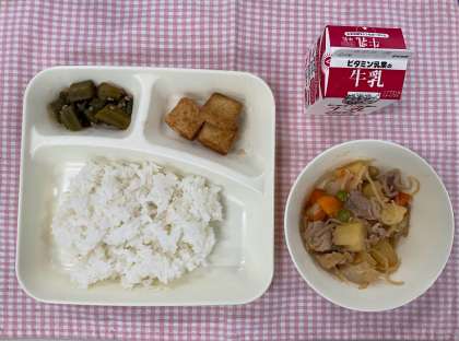 今日の給食は「ごはん、みそ肉じゃが、あつあげのしょうがじょうゆかけ、オクラのおかかいため、牛乳」でした。どれもごはんに合う味付けで、おいしくいただきました。