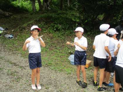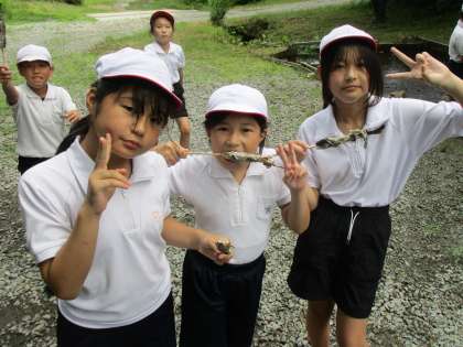 5年生林間学習1日目その9 公開日 2025/07/18 更新日 2025/07/18 お知らせ 魚つかみの様子です。 捕まえた魚は、自分たちで串に刺しました。 スタッフの方に塩焼きにして貰って、美味しくいただきました。 いいね(0)