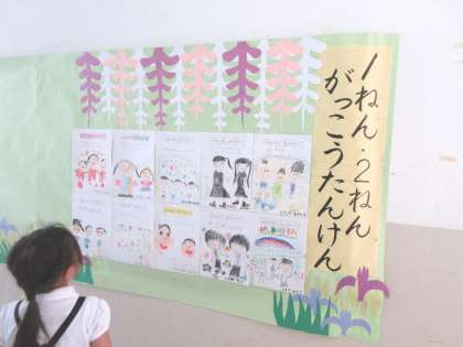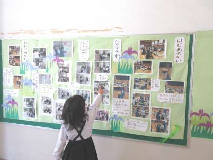 先日の1・2年生の学校たんけんの写真が掲示されています。