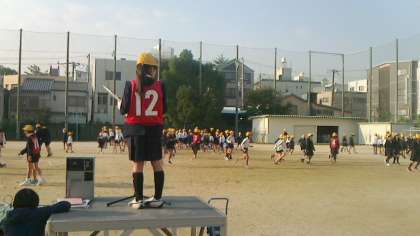 11月8日金曜日、九条北小学校には、児童一人一人が全校児童の前で話をする機会がたくさんあります。例えば、委員会活動の中で集会を進めたり、情報委員会が北小ニュースを話したり、他にも、健康委員会や図書委員会給食委員会など毎日のように校内放送を使って発表する場面があります。また、高学年に限らず終業式では、各クラスの代表が長期休業に向けての楽しみや頑張ったことを発表する場面など年間を通じて、互いに発表する場面を多く設けています。写真は、今朝の児童集会で集会委員の進行で「島おに」というおにごっこをみんなで楽しんでいる様子です。