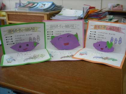 おいもパーティー招待状 公開日 2013/11/18 更新日 2013/11/18 お知らせ 11月18日月曜日、2年生はおいもパーティーの準備を進めています。その準備のひとつ、1年生へのかわいい招待状ができあがりました。近々、1年生に渡されます。 いいね(0)