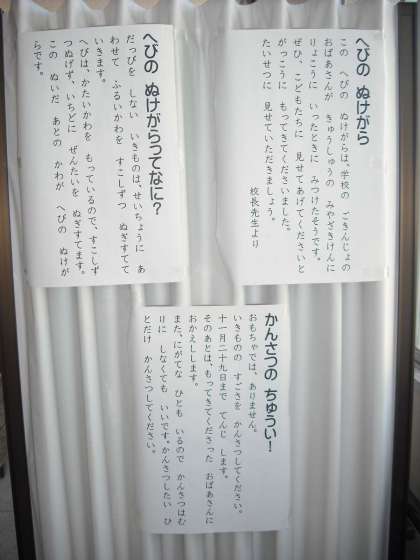 11月19日火曜日、今月初めごろに地域の方が「子どもたちに見せてあげて。」とへびのぬけがらを学校に届けてくださいました。九州に旅行に行かれた際に見つけられたそうです。長さはなんと、140cm程。昔はよく見かけたへびですが、最近では姿を見ることも減りました。苦手な子もいるので東校舎2階家庭科室前の廊下の隅に説明書きを添え、ついたてを置いて、見たい子が自由に見られるようにしています。今月いっぱい展示しています。日曜参観の時にでも興味のある方はどうぞご覧ください。また、お持ちくださった方に、この場を借りてお礼申しあげます。