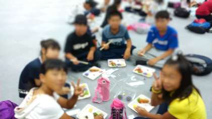 少し雨がぱらぱら降ってきたので、屋根のある場所で、昼食をとっています。