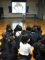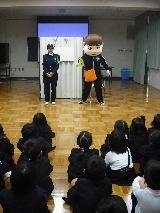 1月8日水曜日、警察の主催で1年生は防犯教室を行いました。内容は、誘拐に合わないようにするためにどうすればいいのだろう?という学習でした。「おかしをあげるよ。」「道がわからないから教えて。」「おいで、おいで」と声をかけていきなりつかまえる。「お家の人が事故にあったから、病院へつれていってあげる。」などいろいろな方法で近寄ってきた怪しい人には距離を保つこと。大声で助けを呼ぶこと。走って逃げること。などを教えていただきました。