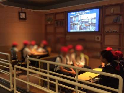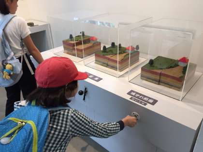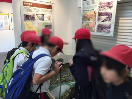 雨も小降りになり、無事北淡震災記念公園に到着しました。語り部の方の話を聞いた後、断層保存館へ移動し、班活動をしています。