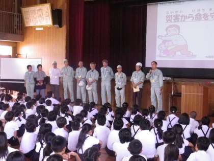 まず1時間目は、地域の防災リーダーの方々を紹介していただきました。いざという時には、この方々の指示のもと、皆さんと協力して避難をしなければなりません。しっかり顔を覚えておきましょう。