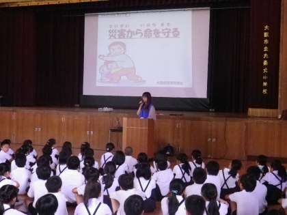 その後は、大阪市危機管理室から来ていただいた方に、「災害から命を守る」ということで、お話をしていただきました。映像を見ながら、地震や津波について学びました。びっくりするような映像もありましたが、みんな真剣に話を聞いていました。