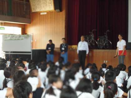 区役所市民協働課の方から、交通安全のDVDを使ってのお話を聞きました。また、パトロール隊の方による自転車の安全な乗り方についても話していただきました。