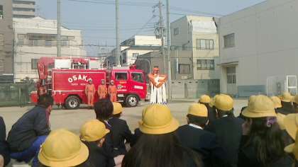3月17日月曜日、5年生は以前に津波に関する防災について区役所の方々と学習しました。その時に、九条では津波が押し寄せた際に、このくらいの高さになるというめやすのシールをデザインしました。このシールが完成し、本日区役所、消防署、地域の方々が来られて設置式をしました。