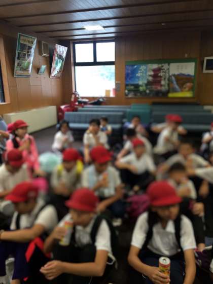 センターでジュースを飲みながら、雨が止むのをまっています。