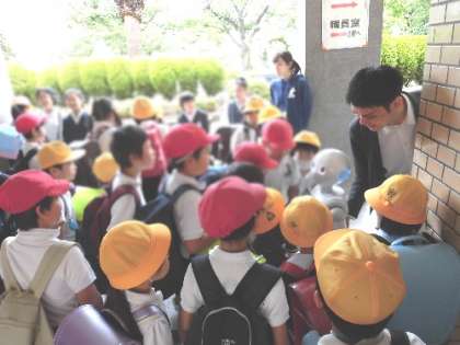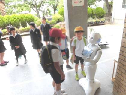 今日はpepperくんも正門の前で子どもたちに挨拶をしてくれました。子どもたちが、pepperくんに「おはようございます!」と元気よく挨拶すると、pepperくんも「おはようございます」と返してくれました。